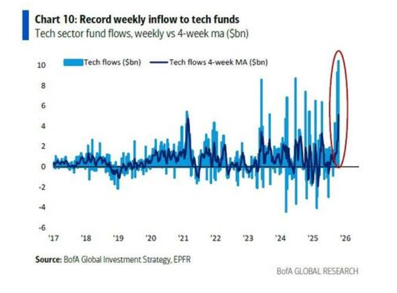 儘管 Hartnett 描繪了謹慎的前景,但最新的資金仍在以前所未有的勢頭湧入科技股與黃金等風險領域。