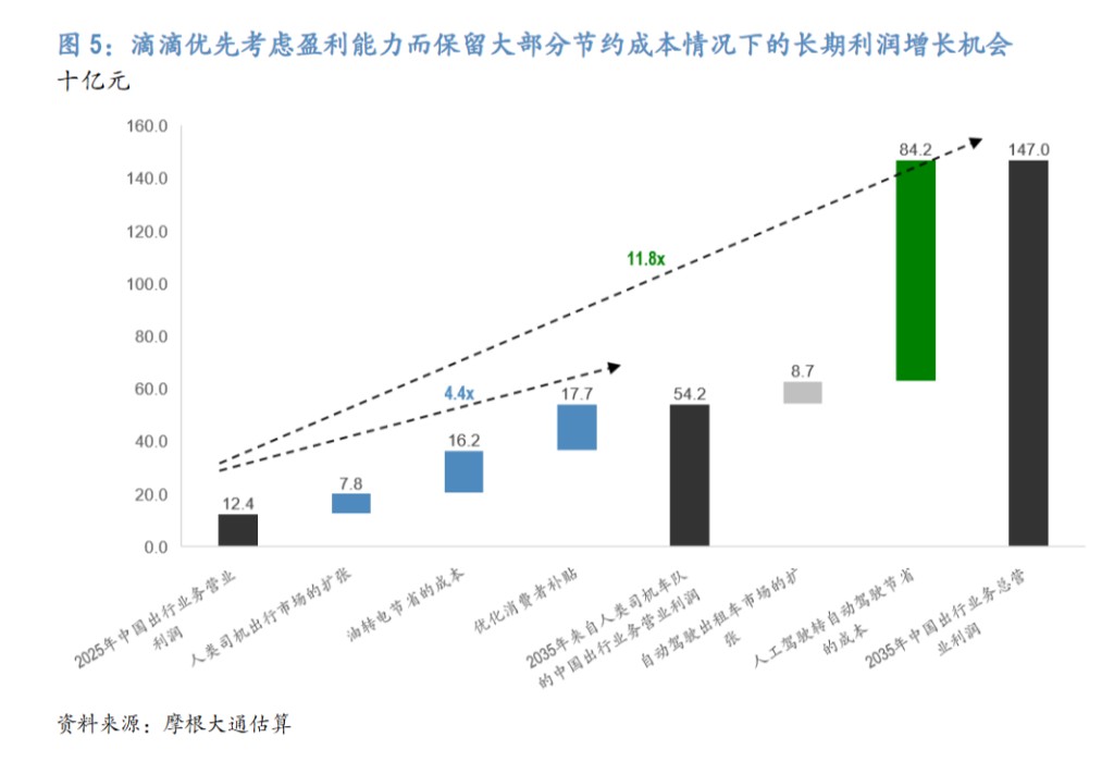 JP Morgan's report pointed out that after achieving autonomous driving, 75%-80% of driver costs, which account for total transaction volume, will be eliminated, potentially increasing profit margins in the entire mobility market by about 50%. Although consumers will be the biggest beneficiaries due to lower prices, mobility platforms with strong network effects and market dominance—especially DiDi—are expected to emerge as winners in this transformation due to their demand aggregation capabilities and bargaining power
