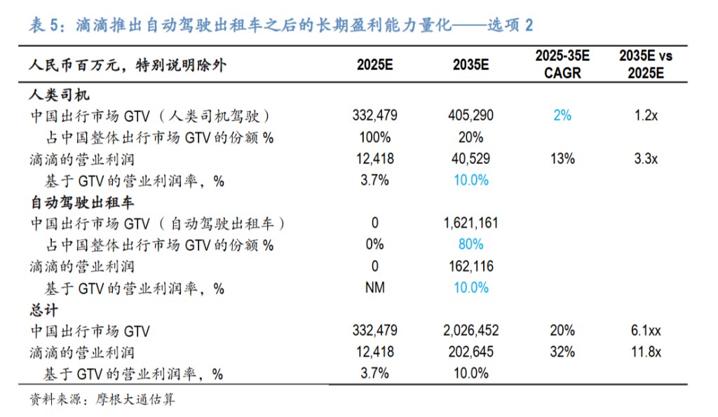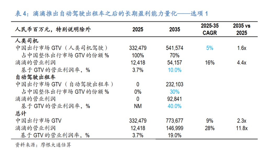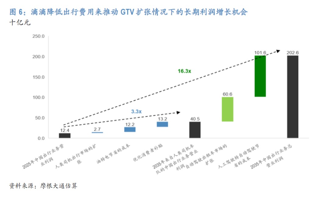 According to the report's estimates, if this strategy is adopted, the annual compound growth rate of the shared mobility market is expected to reach 20%. This will create a powerful "flywheel effect": price reductions drive demand increases, thereby improving vehicle matching efficiency and utilization, which in turn supports a denser supply network, ultimately structurally lowering service costs. Along this path, DiDi's GTV for Chinese mobility is expected to reach approximately RMB 2.03 trillion by 2035. Although the average profit margin per unit is low, the substantial growth in total volume will bring about more considerable absolute profits.