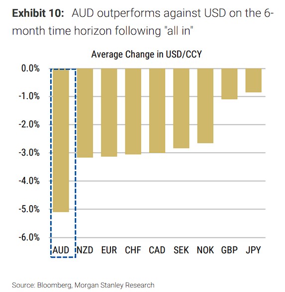 该策略的成功率为73%——在 26 次出现中,有 19 次美元在随后 6 个月内下跌。从货币对表现看,澳元兑美元在"全面上涨"情景后收益最佳。