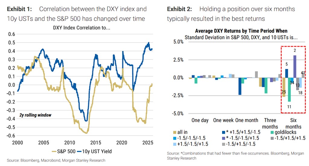 10 月 20 日,据追风交易台消息,摩根士丹利在最新研报中称,当标普 500 指数、美元指数和 10 年期美债收益率出现极端 “共振” 时,美元在未来 6 个月内往往呈现可预测的走势模式。