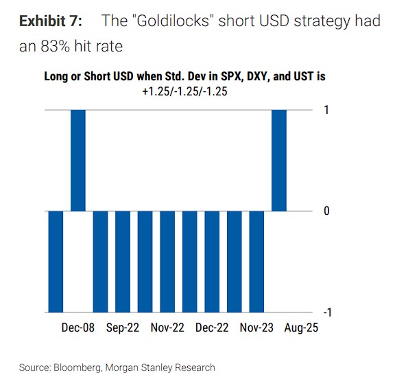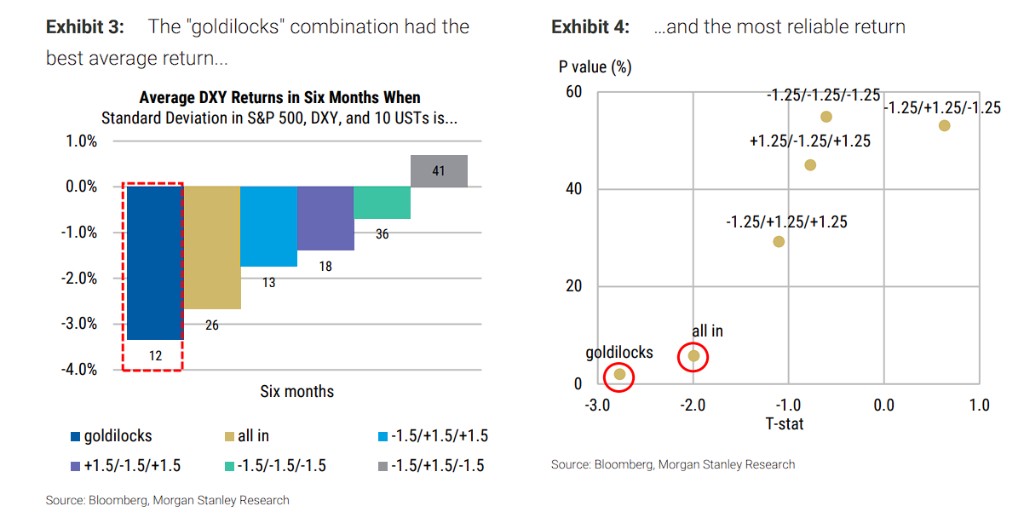 摩根士丹利团队将标准差超过±1.25 定义为"超大幅度"波动,采用 10 年滚动窗口进行计算。在标普 500、美元指数和 10 年期美债收益率三大指标的八种可能组合中,“金发姑娘” 表现最为突出。