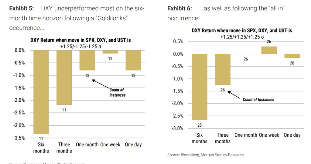 该行称,历史数据表明,在"金发姑娘"情景 (股市大涨超过 1.25 个标准差、美元和美债收益率同时下跌超过 1.25 个标准差),以及 “全面上涨” 情景(标普 500 指数、美元指数和 10 年期美债收益率三者同时上涨超过 1.25 个标准差)出现后,做空美元回报率明显。