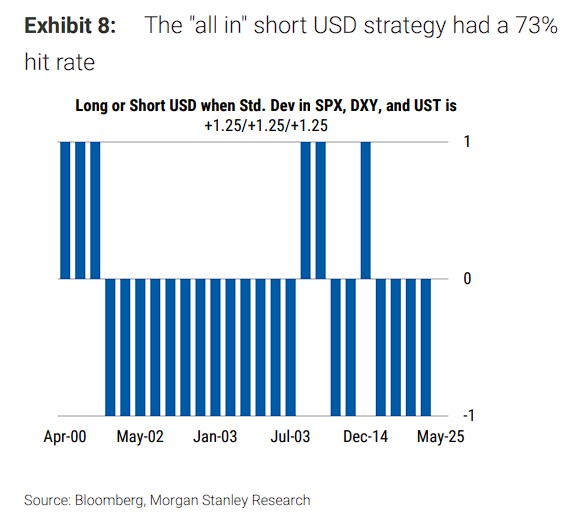 该行策略师 Molly Nickolin 等指出,通过分析过去 25 年中,标普 500 指数、10 年期美债收益率和美元指数三者同时发生极端波动(超过 1.25 个标准差)的交易日,发现两个明确指向美元在未来六个月内走弱的强力信号。