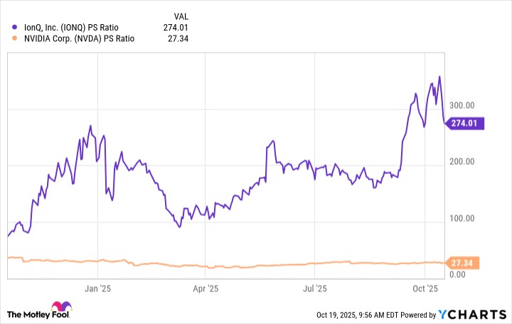 The exciting potential of IonQ's quantum computers led to its shares skyrocketing more than 370% over the past 12 months. Consequently, its stock valuation is exceedingly high, as seen in its price-to-sales (P/S) ratio.