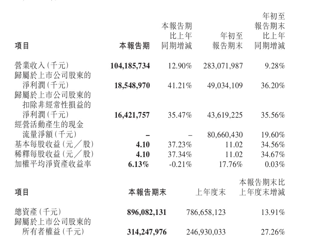 單看第三季度,營收 1042 億元增長 12.90%,淨利潤 185 億元增長 41.21%,利潤增速是營收增速的三倍多。扣除非經常性損益後,前三季度淨利潤 436 億元,同比增長 35.56%。