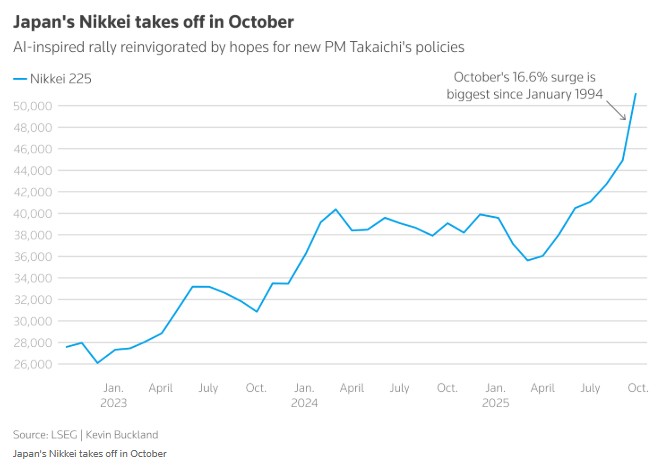 In recent months, technology stocks have become the core driving force behind the continuous rise of the Nikkei index, as global stock markets have revived amid fervent expectations for AI. This month, the Japanese market has also been bolstered by expectations of proactive fiscal stimulus policies from the new Prime Minister, Sanna Takagi.