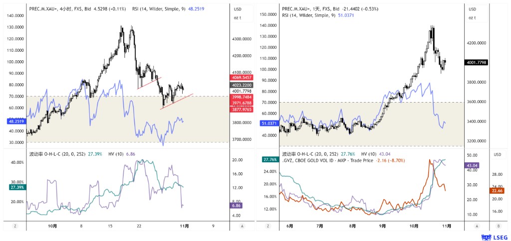 Currently, gold has come down from a high, as shown in the 4H left chart and daily chart, along with the corresponding volatility. The rhythm of the short cycle is quite evident, moving down and correcting step by step. The current gold volatility GVZ has decreased but has not yet reached a low volatility level, and it is expected that the daily level platform may still require time.