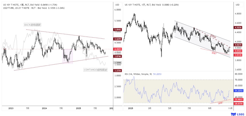 As a result, the market's reaction has seen the core 10Y U.S. Treasury yield return to 4.1%, still converging within that large triangle.
