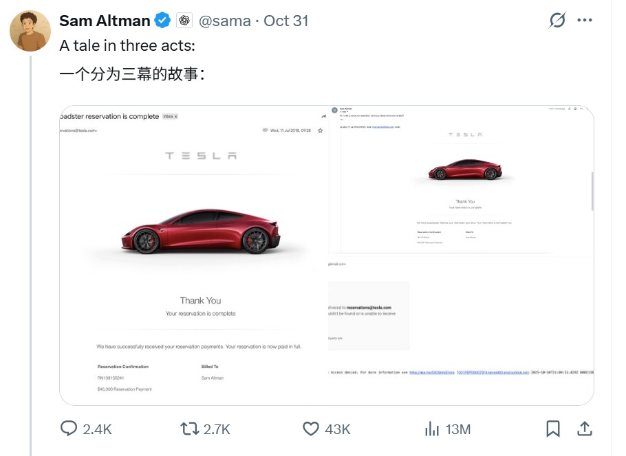 雖然兩人都是 OpenAI 的創始人,但此後他們在社交媒體、法庭文件和公司博客文章中不斷交鋒。最近一次交鋒始於奧特曼發佈了一篇他稱之為 “三幕劇” 的文章,其中包含截圖顯示,他於 2018 年預訂了一輛特斯拉 Roadster 跑車,最近試圖取消預訂並要求退還 5 萬美元的預訂費,但他的郵件卻被退回。
