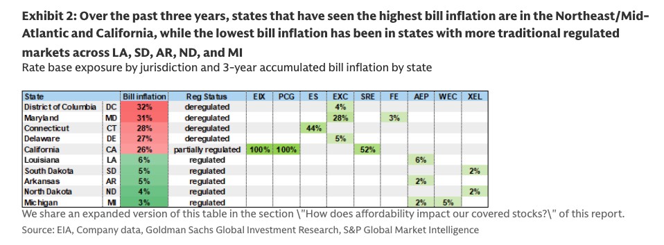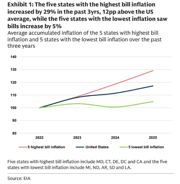 過去三年電費累計通脹高達 29% 的州(如馬里蘭、康涅狄格、特拉華、華盛頓特區及加州),多擁有放松管制或競爭性電力市場;而電費增長較慢的州(如密歇根、北達科他、阿肯色、南達科他和路易斯安那)則多為傳統的受管制市場。
