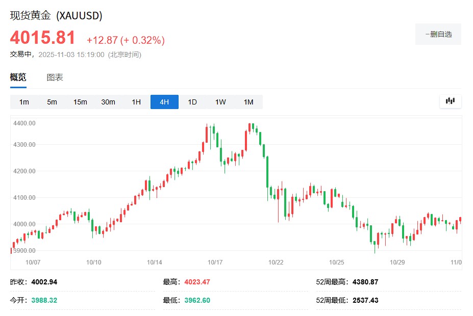 Gold briefly fell to $3,960 in early Asian trading but then surged back above the $4,000 mark, currently nearing $4,020, as investors pay attention to the impact of China, one of the world's largest gold consumption markets, ending its tax incentive policy.