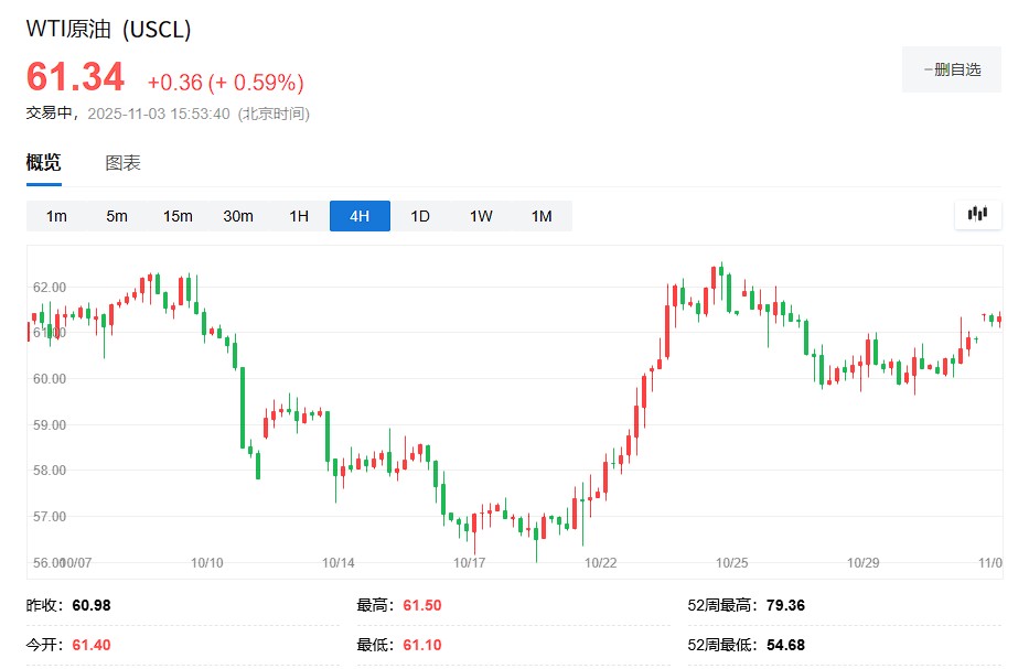 WTI crude oil rose 0.6% to $61.37 per barrel;
