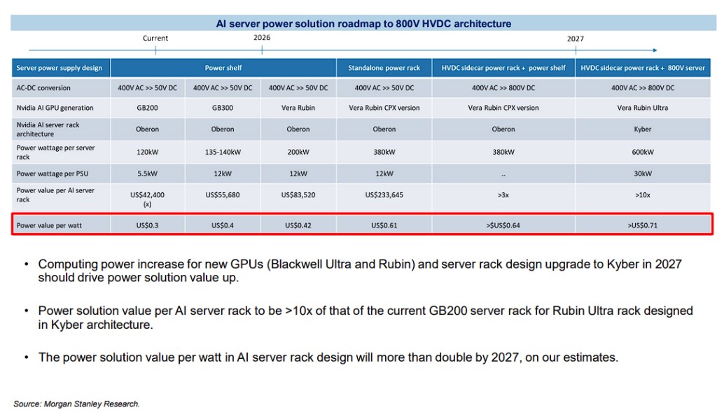 Morgan Stanley expects that by 2027, the value of power supply solutions designed for the Rubin Ultra cabinet (using the Kyber architecture) will be more than ten times that of the current GB200 server cabinet. At the same time, by 2027, the value of power supply solutions corresponding to each watt of power consumption in AI server cabinets will also double compared to the current stage.