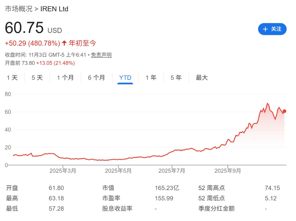 值得注意的是,包括 IREN 在內的許多這類公司,其前身都是比特幣挖礦企業,它們利用在構建和運營大規模計算集羣方面的經驗,成功轉型進入了利潤更高的 AI 領域。在人工智能熱潮的推動下,這家在納斯達克上市的澳大利亞公司股價表現驚人,截至上週五收盤,其年內漲幅 480%。