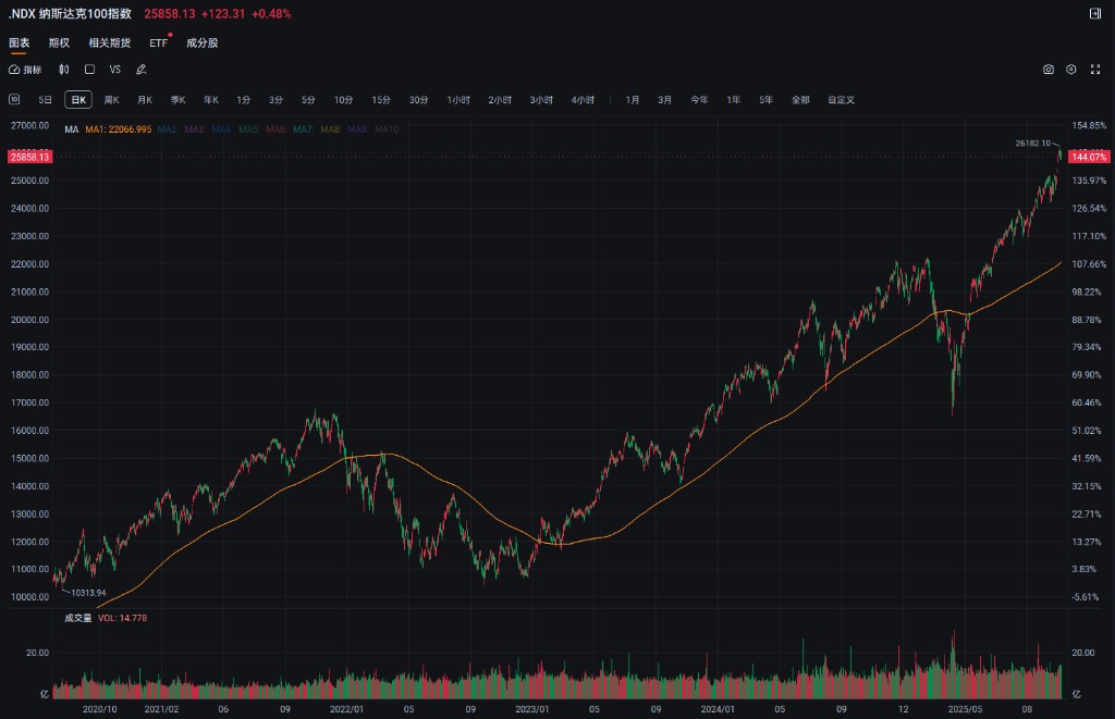 (The chart shows the daily candlestick chart of the Nasdaq index, with the orange line representing the 200-day moving average)