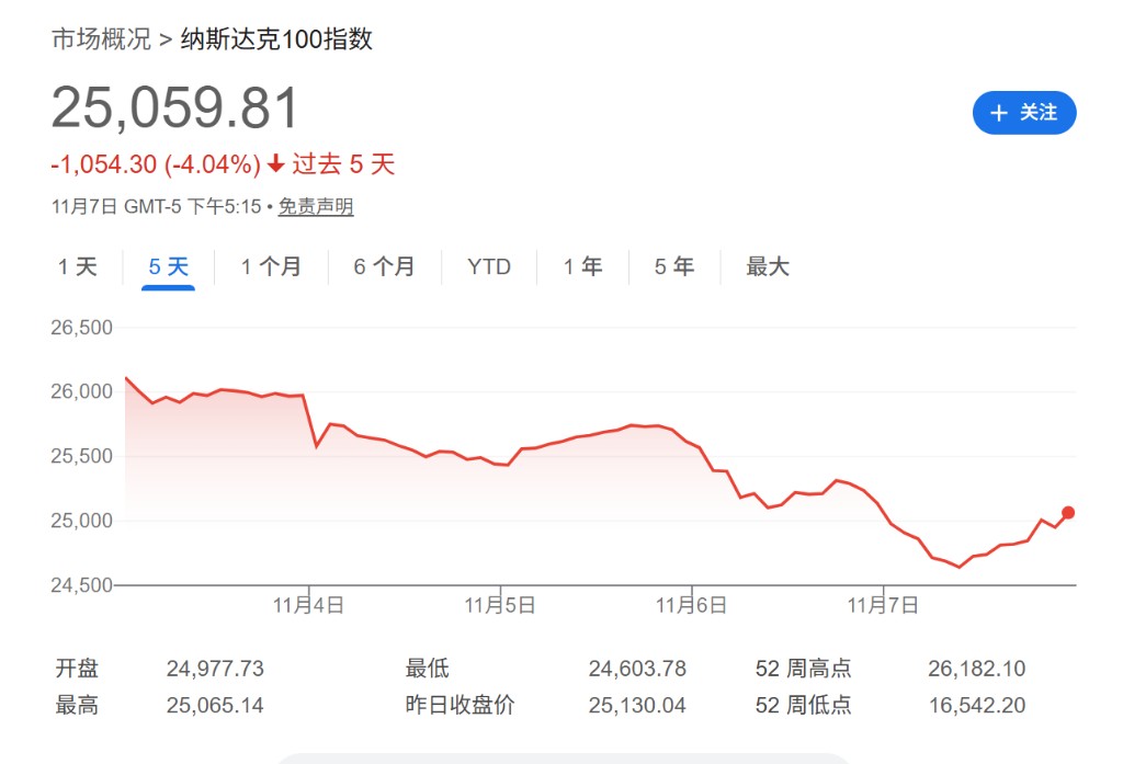 This week, the Nasdaq Composite Index fell by 3%, marking its worst weekly performance since April. Among them, the market capitalization of eight leading companies most closely associated with AI has evaporated by approximately $800 billion, and the total market capitalization of all AI-related companies in the U.S. has lost nearly $1 trillion in a single week. The market is increasingly concerned about massive AI capital expenditures and industry prospects, leading to a sharp decline in investor sentiment