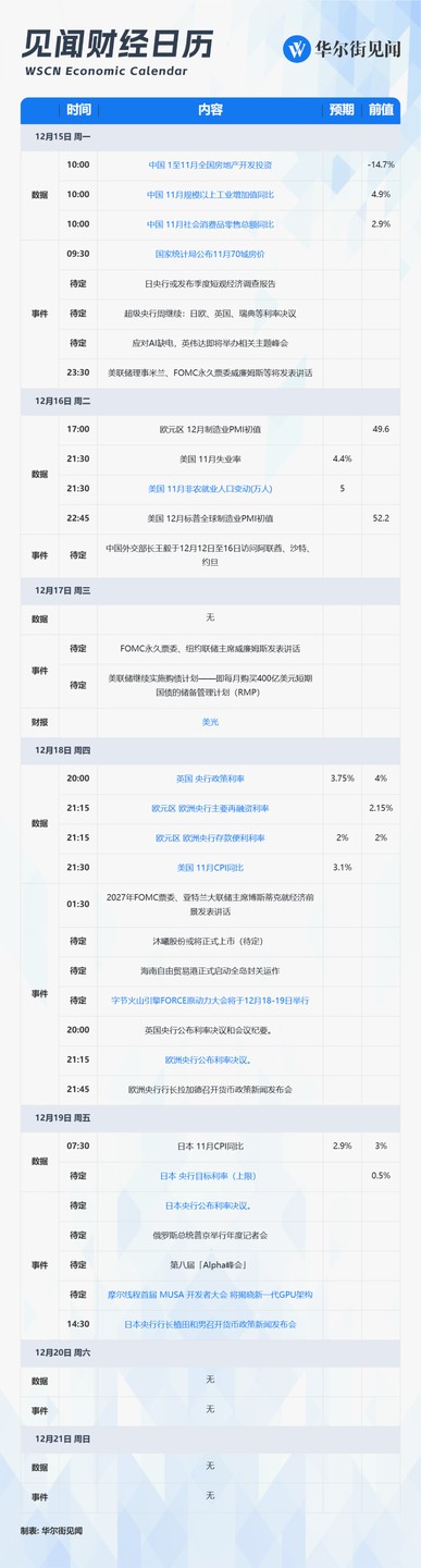 December 15 - December 21 Weekly Major Financial Events Overview, all times are in Beijing time:
