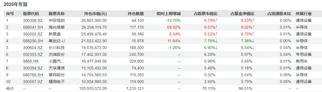 The "twin stars" of domestic computing power chips, Haiguang Information and Cambrian, rank second and fourth, respectively, accounting for over 16% of net value. These are the core targets of the "domestic computing power industry chain" emphasized by fund managers.