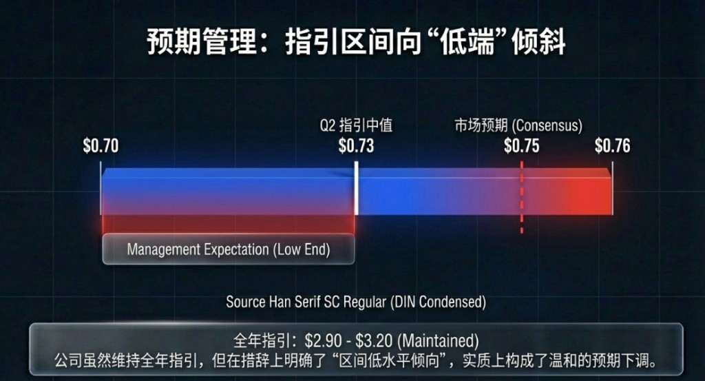 全年來看,公司維持 2026 財年非 GAAP 每股收益 2.90 至 3.20 美元的指引區間不變,中值 3.05 美元略高於市場預期的 3.00 美元,但"區間低水平傾向"的措辭實質上已構成一次温和的預期下調。全年 GAAP 每股收益指引為 2.47 至 2.77 美元。