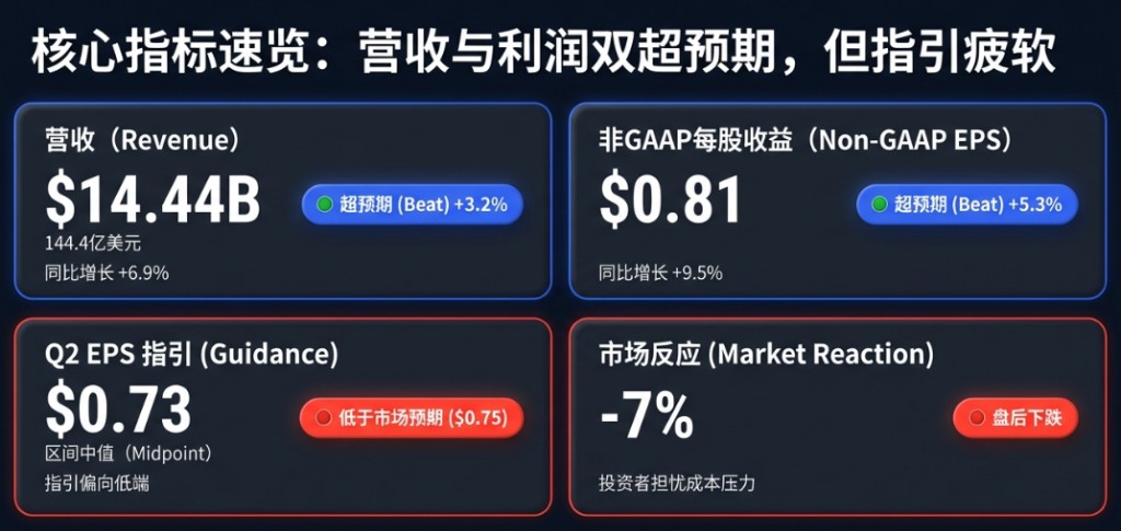 第二財季非 GAAP 每股收益指引區間 0.70 至 0.76 美元,中值 0.73 美元低於市場預期的 0.75 美元;GAAP 每股收益指引區間 0.52 至 0.58 美元。