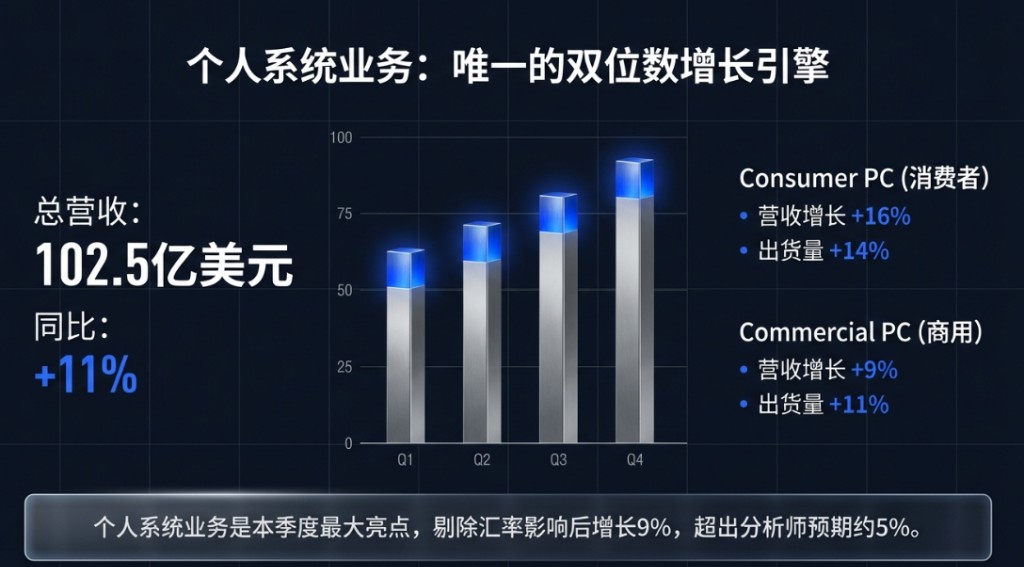 推動業績超預期的核心引擎來自個人系統業務,PC 部門營收同比強勁增長 11% 至 102.5 億美元,其中消費者 PC 更錄得 16% 的高增速,AI PC 持續放量是重要驅動力。