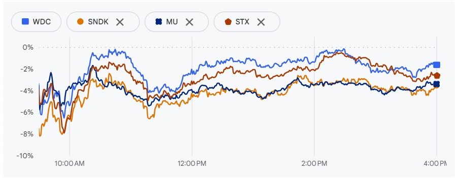 During Wednesday's trading session, the storage chip sector collectively moved lower. Sandisk once plunged 6.5%, Micron Tech dropped 4%, and Western Digital and Seagate Technology fell more than 4% and 5%, respectively. As market sentiment was somewhat digested toward the end of the session, the declines in related stocks narrowed. By the close, Sandisk and Micron Tech both fell over 3.4%, Seagate Technology closed down 2.6%, and Western Digital's decline narrowed to 1.6%. On that day, the Storage Chips and Hardware Supply Chain Index closed at 113.03 points, having touched an intraday low of 109 points.