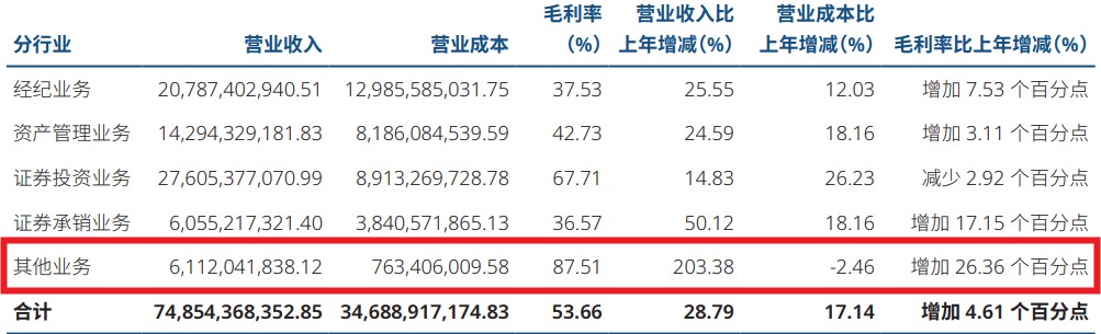 Specifically, brokerage business still accounted for the largest share, achieving an income of 20.787 billion yuan for the full year, a year-on-year increase of 25.55%; asset management business achieved an income of RMB 14.294 billion, a year-on-year increase of 24.59%; securities investment business achieved an income of RMB 27.605 billion, a year-on-year increase of 14.83%; and other businesses achieved an income of RMB 6.113 billion, a year-on-year increase of 203.38%.