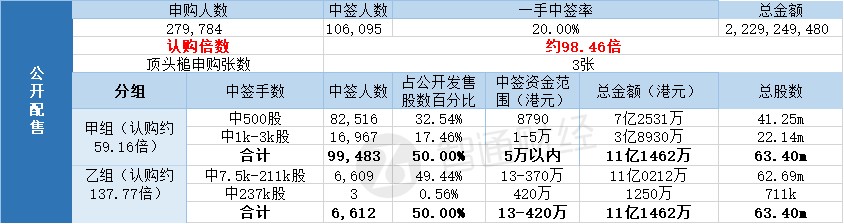其中,公開配售申購人數 279784 人,一手中籤率 20%,認購倍數約 98.46 倍。