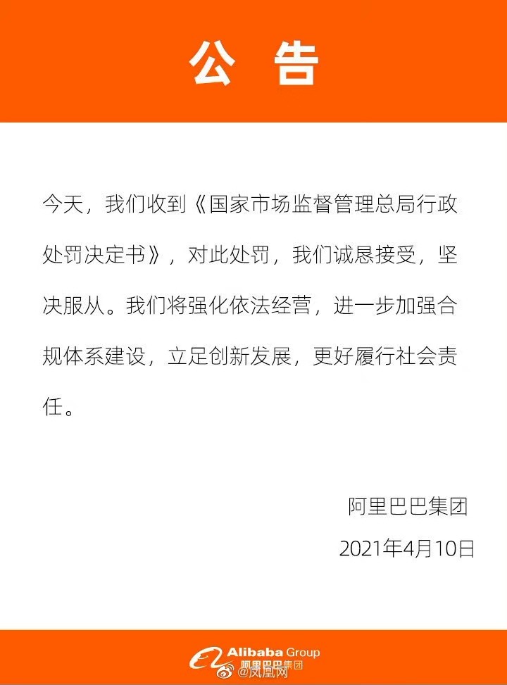 阿里巴巴表示,我們收到《國家市場監督管理總局行政處罰決定書》,對此處罰,我們誠懇接受,堅決服從。