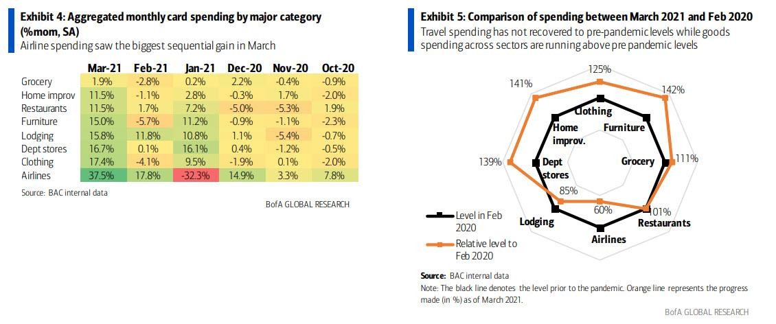 匯總美國銀行發行的信用卡和借記卡消費數據,美銀美林預測,3 月剔除汽車之後的美國零售銷售將環比大幅增長 11.1%,有望創下紀錄第三高,而這還是在旅遊開支尚未恢復到疫情前的水平……