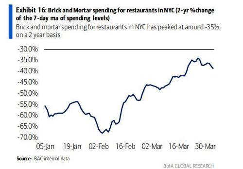 另外,推動消費支出增長的另一大動力源是餐館消費,在七天內(2 年變化)支出增長 13%,而 3 月中旬還處於負增長。