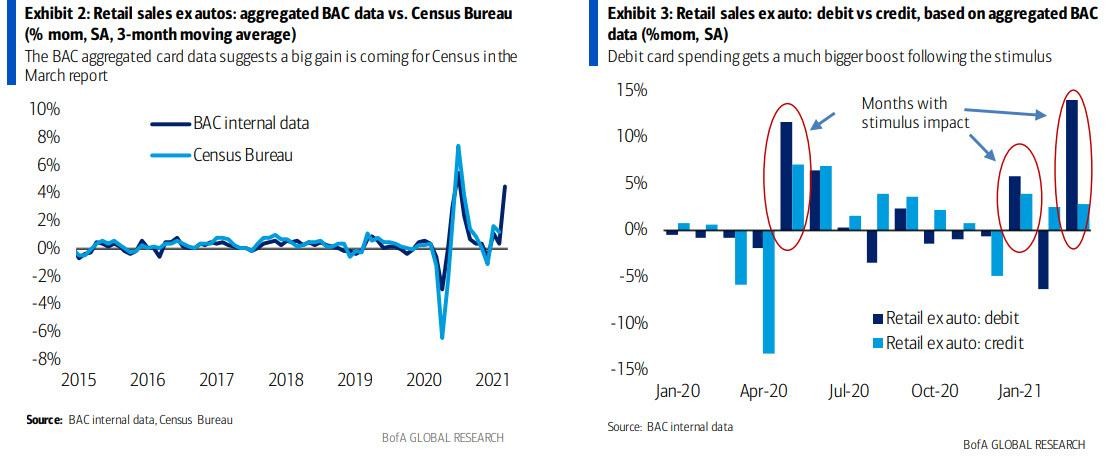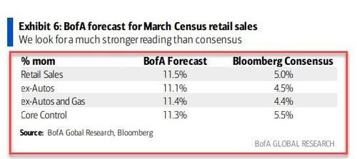 美銀美林在最新發布的報告中,預計 3 月美國零售銷售額環比將大幅增長 11.1%(剔除汽車銷售),這個預測是目前華爾街共識預期的三倍,如果成真,將創下有紀錄以來第三高。