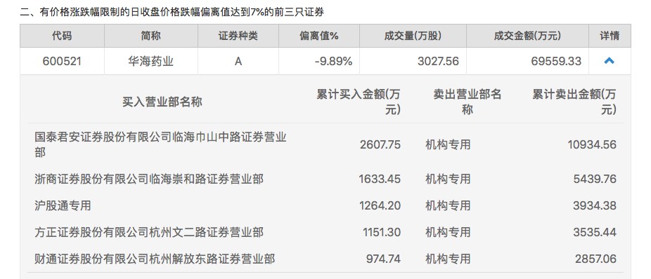 4 月 7 日, 華海藥業早盤遭遇閃崩跌停。盤後龍虎榜數據顯示,五機構 “攜手出逃”,合計共賣出 2.67 億元。