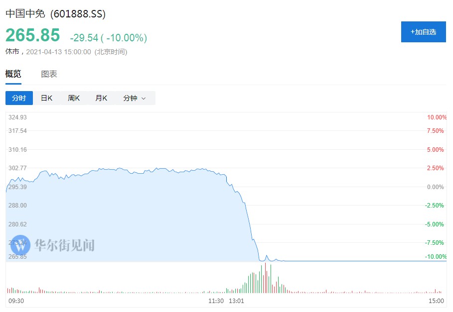中國中免週二午後閃崩跌停,報 265.85 元,封單近 1.1 萬手,成交額超 40 億元,而早盤中國中免一度漲逾 2%。