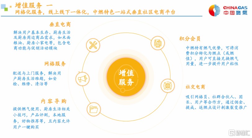 不過,地產和物業的商業模式已經有不少分析師專門研究了,此處不做延展,筆者想進一步分析的是,另一個業務邏輯類似且增長速度迅猛,但暫時還沒有被太多人關注到的行業——城市燃氣。城市燃氣公司往往擁有龐大終端用户體量和服務網絡,結合精細化客户經營所開展的增值服務業務,實則藴藏巨大潛能。