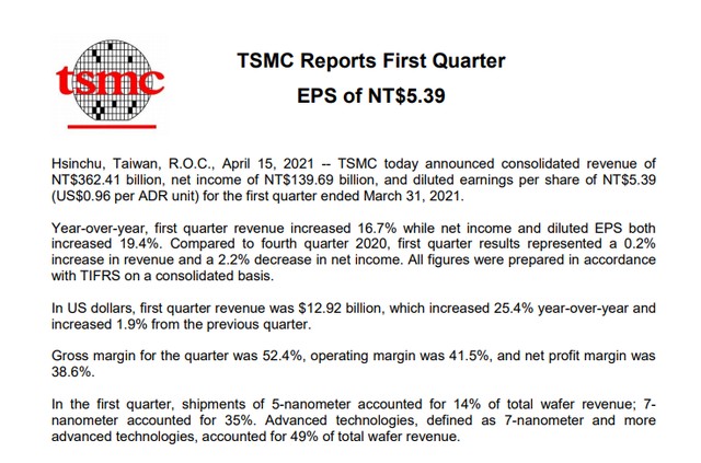 一季度,台积电 5nm 出货量占晶圆总营收的 14%,7nm 占 35%。整体而言,先进技术(7nm 和更先进技术)占晶圆总营收的 49%。