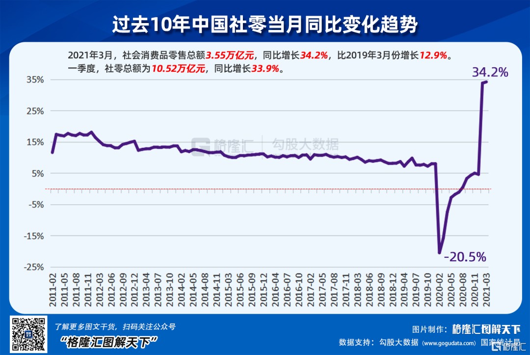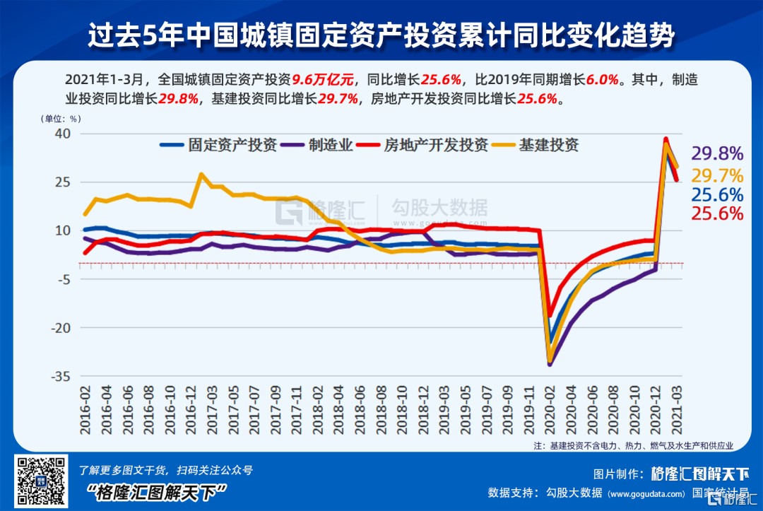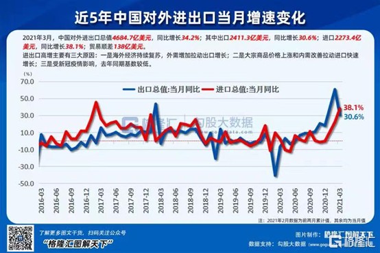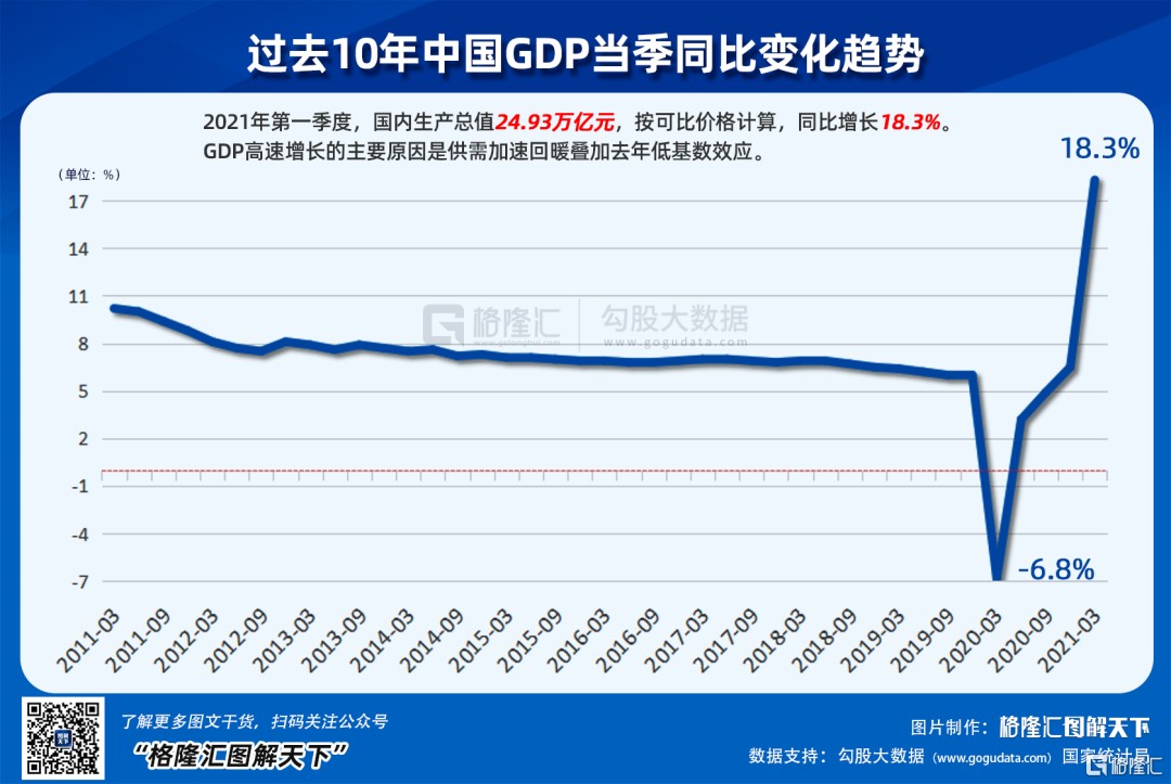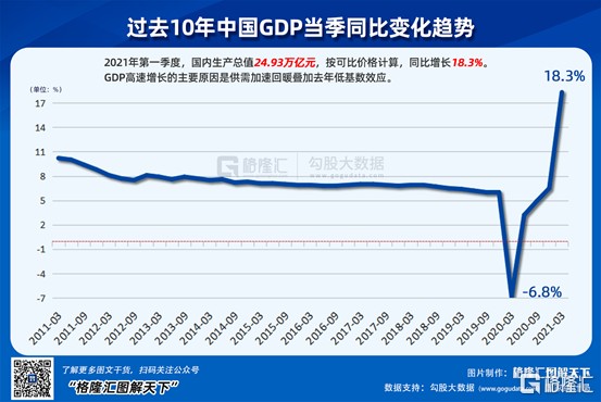 GDP 同比增长 18.3%,这不知道是多少年没有的增速了。当然也不用兴奋,因为背后的原因是去年一季度受到疫情破坏,基数低,如果看两年,相比 2019 年同比增长 10.3%,平均是增长 5%。