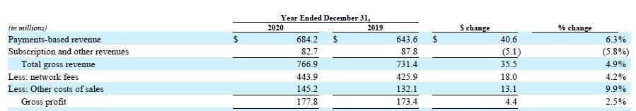 如今,經歷了 25 年經驗的積累,FOUR 已經擁有了超過 20 萬的客户,有 7000 以上個銷售夥伴支持,年均完成超 350 億筆的各類交易,並實現 350+ 項技術融合。2020Q4 的財報電話會議顯示,FOUR 已實現 21 年利潤連續增長。僅第四季度端到端的支付體量便以實現 12% 同比增長,達到 68 億美元。其中通道內容佔總收入的 63%,相對於去年的 54% 佔比大幅度增長。
