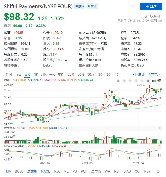 儘管其主要客户——酒店和餐館在疫情期間受到衝擊較大,但 FOUR 營收仍在節節攀升。截止到 2021 年 4 月,FOUR 已突破 100 美元大關,並有向上勃發的趨勢。