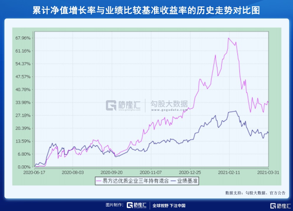 截止到今年一季度,易方達優質企業三年持有基金份額淨值為 1.3367 元,本報告期內,該類基金份額淨值增長率為-2.12%,同期業績比較基準收益率為 0.24%。