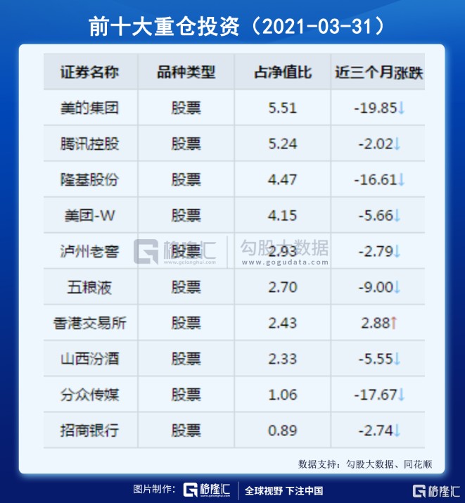 前十大重倉股為:美的集團、騰訊控股、隆基股份、美團-W、瀘州老窖、五糧液、香港交易所、山西汾酒、分眾傳媒、招商銀行。