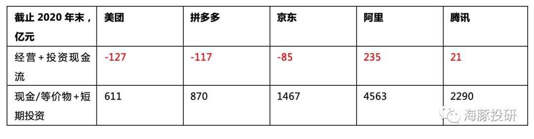 據海豚投研統計,幾大互聯網巨頭中,美團現金彈藥相對較少,投入卻是最多的。上市三年,美團投資 + 經營活動現金流持續為負,2020 年下半年加大投入後,投資 + 經營活動現金流更是達到了-127 億,2020 年底現金等價物 + 短期投資大約 611 億。