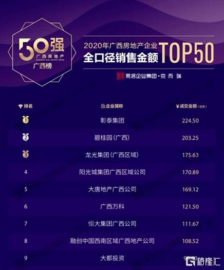 在收併購市場,融創一直是一個頗具話題性的選手,而此次其收編的彰泰在廣西房地產市場可謂是領頭羊企業。根據 2020 年克爾瑞廣西房地產企業全口徑銷售金額排行榜,彰泰集團成交金額達 224.5 億,位列第一,緊接着依次是碧桂園、龍光、陽光城,且相差金額不大,反映出廣西市場競爭之激烈。