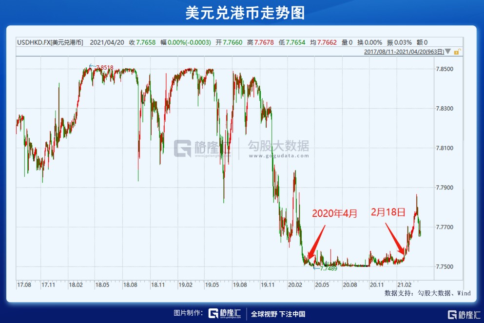 年前,大藍籌推動着指數再度上漲。年後 2 月 18 日,央行再度重磅出手,大幅回籠資金,壓制市場泡沫的決心很是堅決,市場迎來了一波快速暴跌,跌速比 2020 年 3 月還要快。恰巧的是,從 2 月 18 日開始,美元兑港幣匯率離開 7.75 強勢端,可以推測海外熱錢有撤離現象。