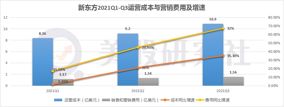 新东方第三季度运营成本为 10.9 亿美元,同比增长 35.10%;第三季度销售和营销费用为 1.56 亿美元,同比增长 32%;第二季度运营成本为 9.2 亿美元,第二季度销售和营销费用为 1.34 美元。