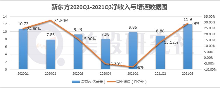 新东方第三季度净收入 11.9 亿美元,与去年同期的 9.23 亿美元相比增长 29%,2021 财年第二季度的净收入为 8.88 亿美元。
