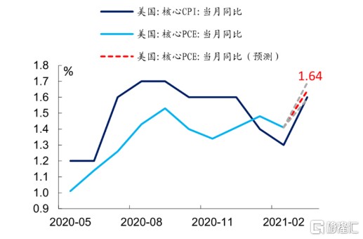 首先值得注意的是,美聯儲衡量通脹的標準其實並非 CPI,而是核心通脹數據——個人消費支出 PCE。根據 Forecasts 的預測,3 月份的核心 PCE 將大概率落在 1.589%~1.691% 的區間範圍內,並未達到美聯儲制定的長期通脹目標。