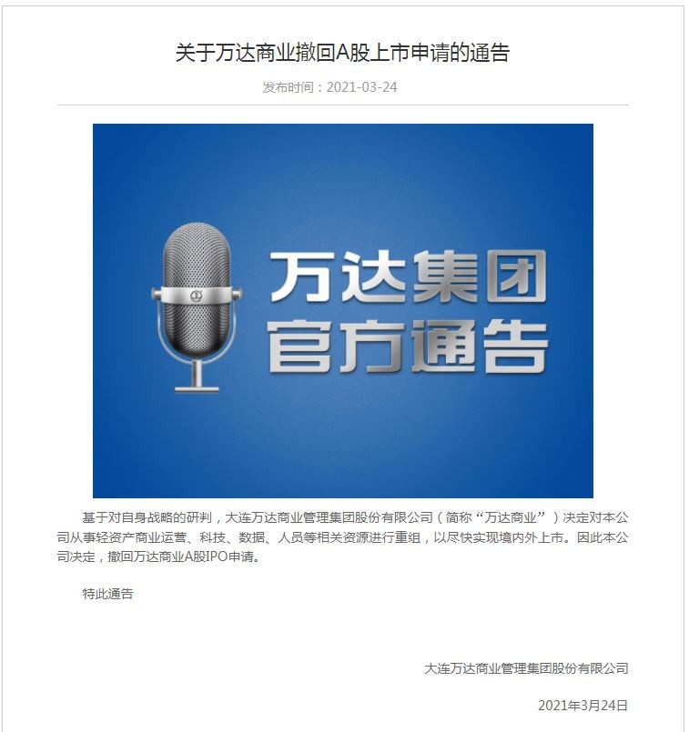此前 3 月,萬達輕資產商管公司母公司萬達商業宣佈撤回國內 IPO 申請。公司通告稱,基於對自身戰略的研判,萬達商業決定對本公司從事輕資產商業運營、科技、數據、人員等相關資源進行重組,以儘快實現境內外上市。因此本公司決定,撤回萬達商業 A 股 IPO 申請。