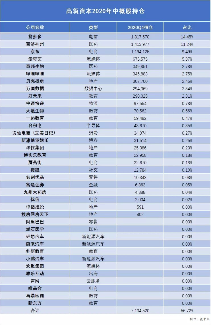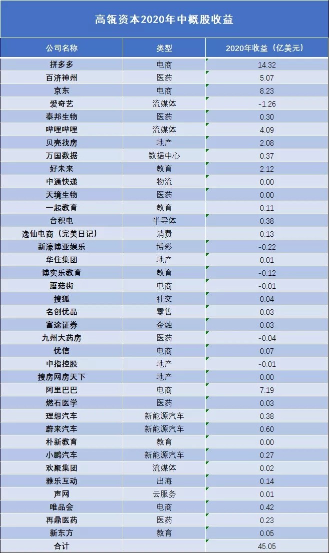 先看高瓴,如上表所示,2020 年高瓴資本先後持有 37 只中概股股票,全年總收益約 45 億美元。